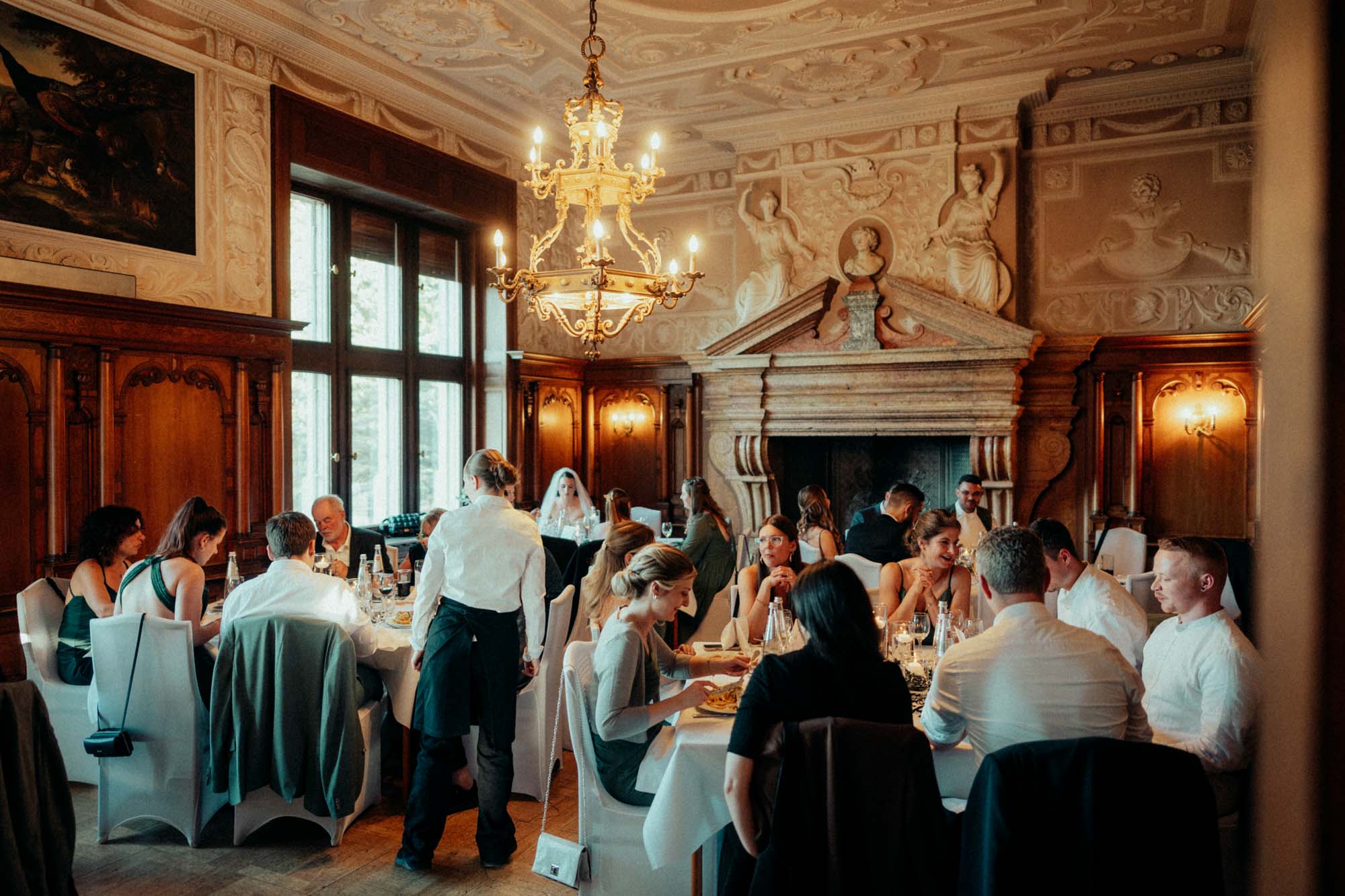 Die Räume des Schlosses selbst tragen den historischen Stil mit Blick auf Details: der Festsaal, elegante Foyers und die Möglichkeit, das Schloss exklusiv zu buchen.